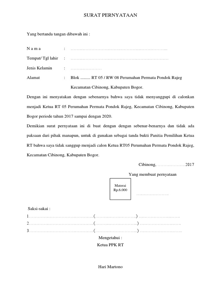 Surat Pernyataan Tidak Sanggup Rt Pdf