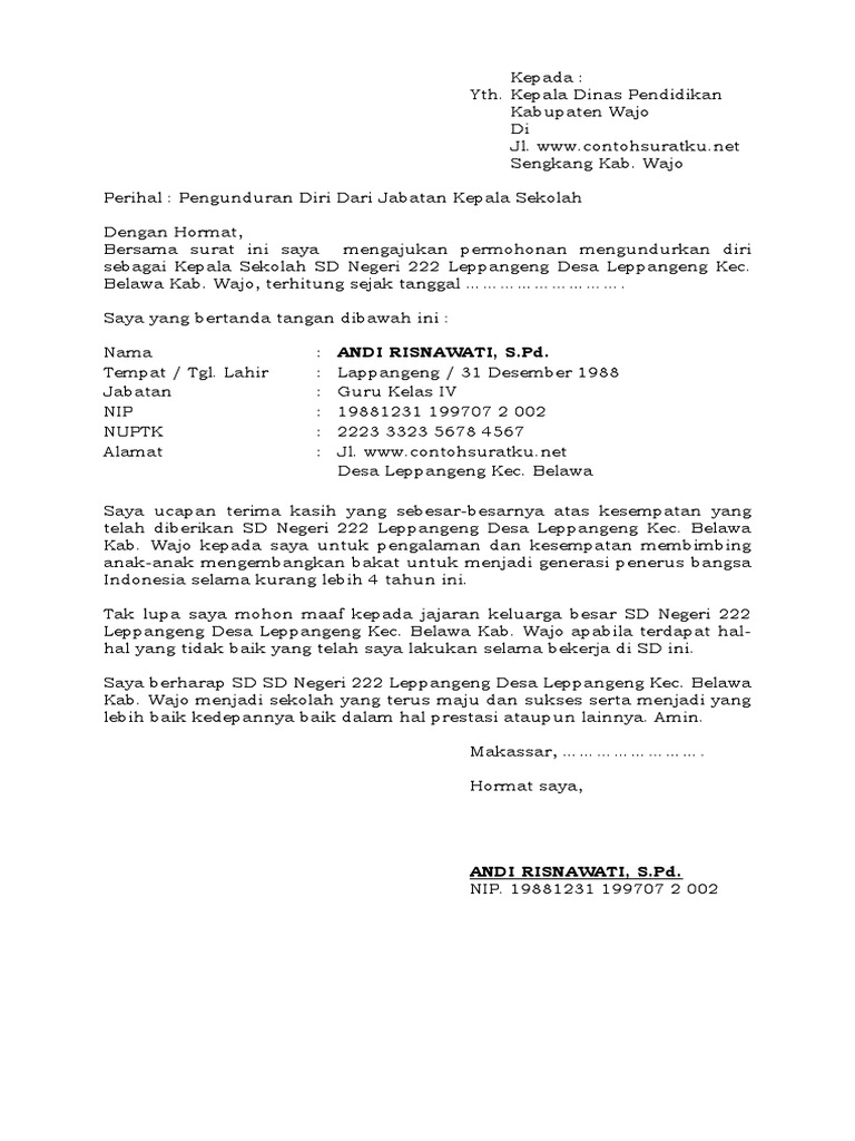 Wajo perihal pengunduran diri dari jabatan kepala sekolah dengan hormat bersama surat ini saya mengajukan permohonan mengundurkan diri sebagai kepala sekolah sd negeri 222 leppangeng desa leppangeng kec. Misalnya saja pernyataan tertulis dari atas nama sekolah. Terlebih untuk urusan penggunaan surat pribadi bisa dikatakan sudah sangat sulit ditemukan sekarang ini.
