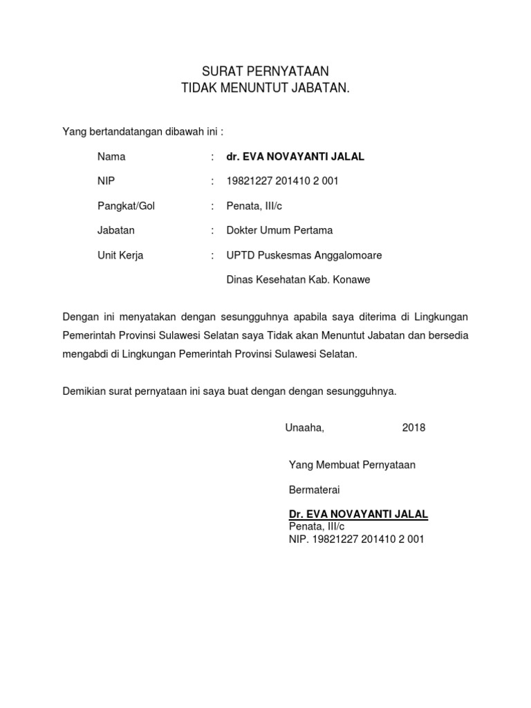 Contoh surat pernyataan tidak menuntut jabatan yellow jacke. Surat pernyataan tidak akan menuntut ini memiliki format sebagai berikut. Tidak menuntut untuk menduduki suatu jabatan tertentu;
