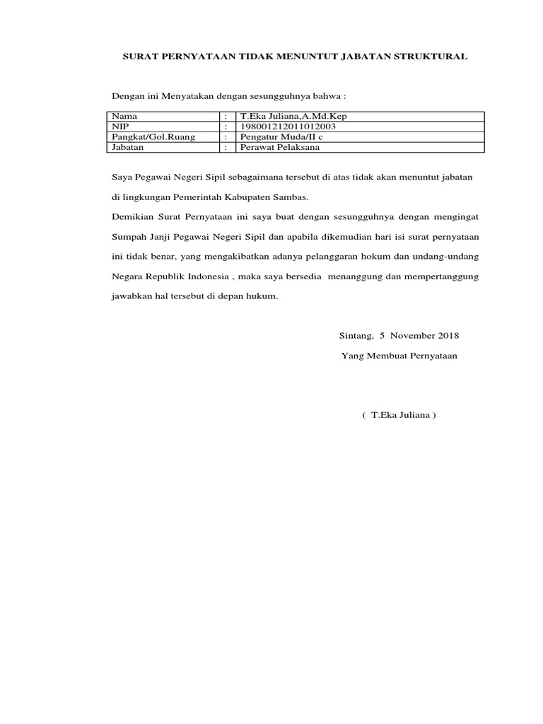 Surat Pernyataan Tidak Menuntut Jabatan Struktural Pdf